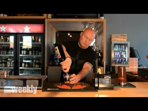 Check out Josh Patterson at Bar 46 as he mixes up one of their new cocktails - Peach Infused Manhatten.